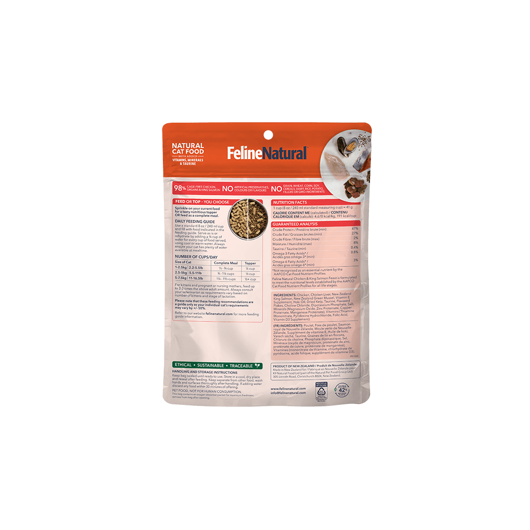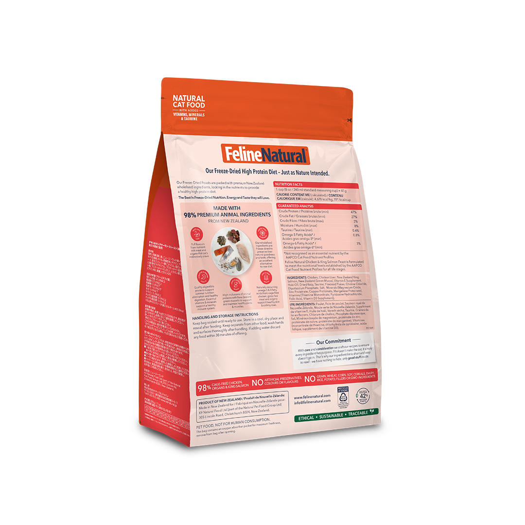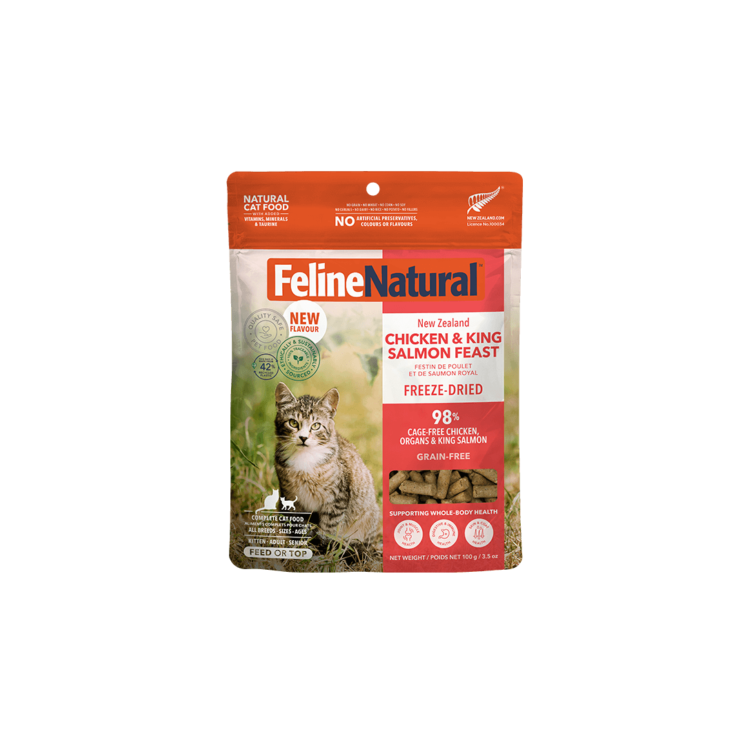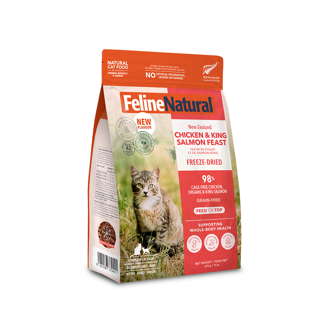 Our complete and balanced Freeze-Dried New Zealand Chicken & King Salmon Feast contains 98% Cage-Free Chicken & Organs and sustainably farmed King Salmon, with New Zealand Green Mussels, Vitamins, Minerals and Taurine in support of your cat's whole-body health.