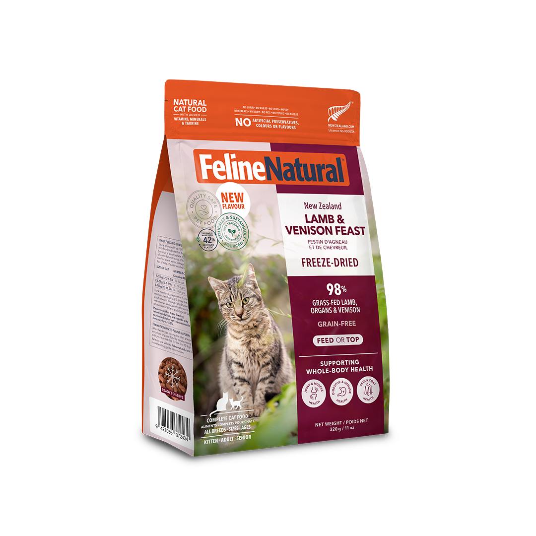 Our complete and balanced Freeze-Dried New Zealand Lamb & Venison Feast contains 98% Grass-fed & Grass-finished Lamb, Venison & Organs, with New Zealand Green Mussels, Flaxseed Flakes, Oils, Kelp, Vitamins, Minerals and Taurine in support of your cat's whole-body health.